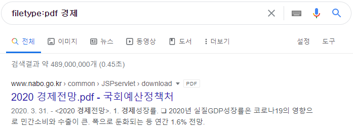 | filetype | 검색 결과를 특정 파일 확장자로 제한하는 명령어이며 “ext:”로 대체할 수 있습니다(예: filetype:pdf 경제) ![]() |