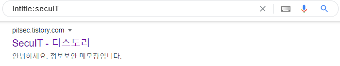 | intitle | 페이지 제목(타이틀 태그)에 특정 검색어가 포함된 페이지를 찾도록 명령하는 기능을 합니다 (예: intitle:secuIT) ![]() |