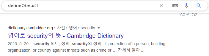| define | 기본적으로 구글에 내장된 사전의 기능을 하는 명령어이며 검색어에 대한 정의가 표시합니다 (예: define:SecuIT) ![]() |