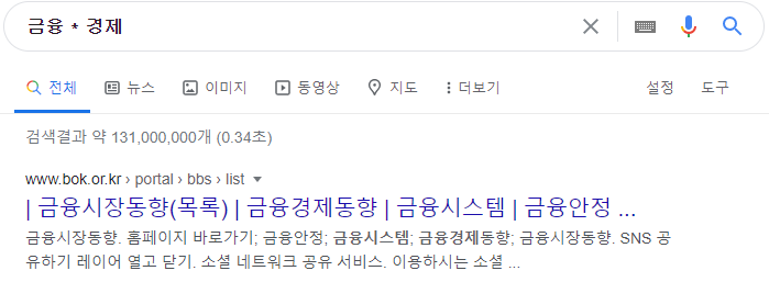 | * * | 와일드카드처럼 작용해 어떤 단어와도 매치되는 기능이며 정확한 검색어를 모를 때 유용합니다 (예: 경제 * 금융)![]() |