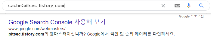 | cache | 해당 명령어 뒤에 URL을 추가하여 검색하면 구글에 가장 최근 색인된 해당 웹페이지의 캐시 버전을 보여줍니다 (예: cache:pitsec.tistory.com) ![]() |