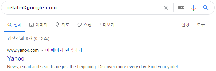 | related | 특정 웹사이트와 비슷한 웹사이트를 찾아주는 명령어입니다 (예: related:google.com) ![]() |