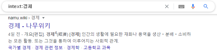 | intext | 본문에 검색어를 포함하는 페이지를 찾도록 명령하는 기능을 합니다 (예: intext:경제) ![]() |