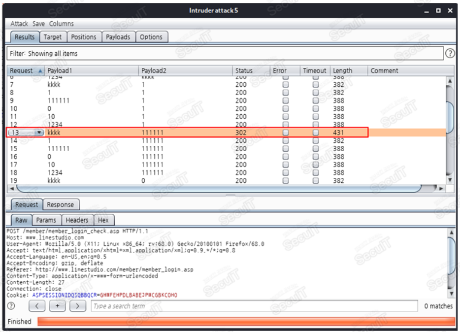 [그림 3-7]의 Status 상태 값 200, 302가 있습니다. 웹 응용 프로그램 동작에 따르면 잘못된 암호가 코드 응답 200을 반환하고 성공한 암호가 코드 응답 302를 반환합니다.