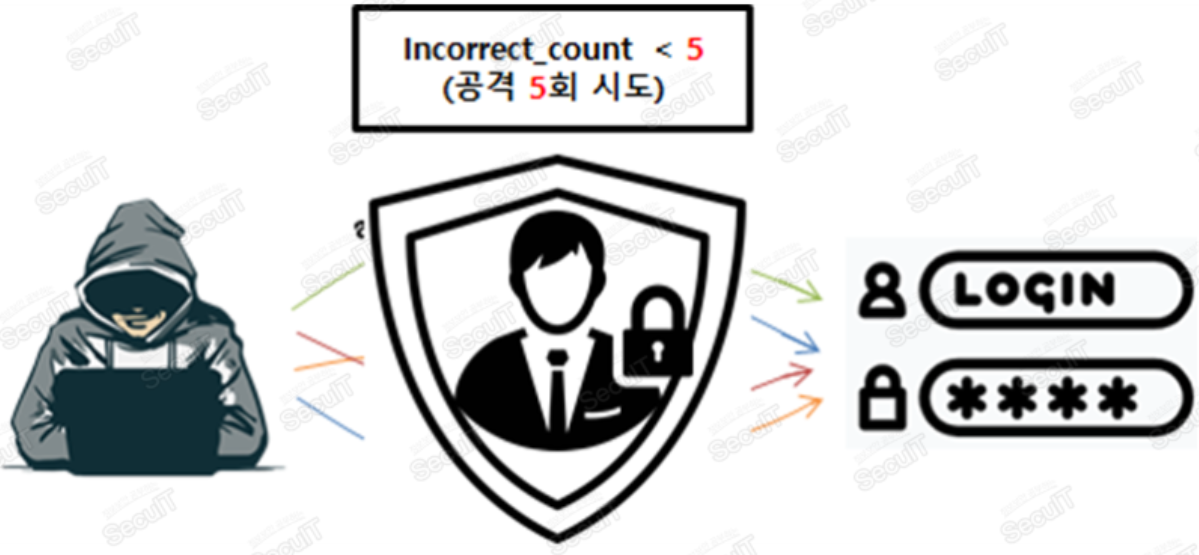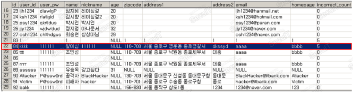 본 공격의 분석 결과 대응 방안으로 공격 횟수를 셀 수 있도록 대책을 세웠고 DataBase의 Table 안의 Column(incorrect_count)을 추가였습니다.