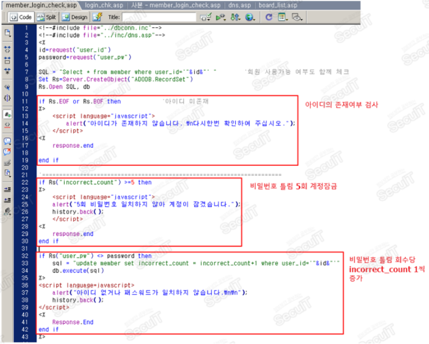 아이디와 비밀번호를 검사하는 페이지(member_login_check.asp)에 Secure Code를 적용하였습니다.
