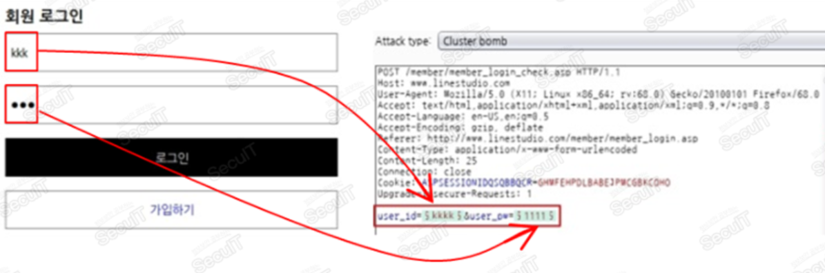 아이디와 비밀번호를 전송하는 파라미터를 확인하여 해당 부분의 값만을 계속 변경하여 로그인 시도를 하는 과정이다.
