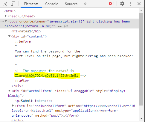하지만 F12키, 키보드는 막혀있지 않아 크롬 개발자도구를 이용해 주석처리된 natas2로 갈 수 있는 비밀번호를 어렵지 않게 획득할 수 있습니다.