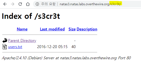 해당 힌트를 URL을 통해 진입결과 디렉터리 리스팅 취약점이 발견되었고 users.txt 파일이 노출됩니다.