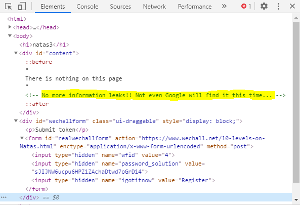 역시나 F12 개발자도구를 통해 힌트를 찾습니다. 이번엔 주석으로 No more information leaks!! Not even Google will find it this time...