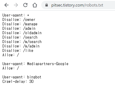 일반적으로 웹은 로봇을 통해 웹 페이지의 코드들을 크롤링합니다. 그래서 robots.txt 파일에 진입 해봅니다.