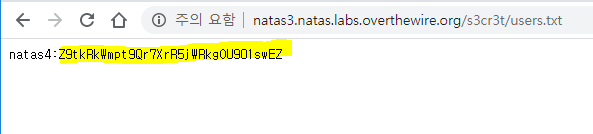 txt파일 클릭결과 natas4:Z9tkRkWmpt9Qr7XrR5jWRkgOU901swEZ 비밀번호를 획득할 수 있습니다.