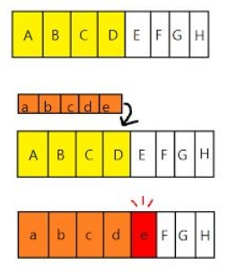 노란색의 정의된 공간에 'ABCD'가 들어있다고 정의한다. 'ABCD'가 들어있는 공간은 4라고 가정했을 때, 'abcde'인 데이터 크기 5인 값을 넣는다면 정상적으로는 오류가 일어나야한다. 하지만 노란색 공간 이외의 인접한 다른 공간(EFGH)에 덮어씌워지며, 해당 공간의 값을 변조(eFGH)시키고 있다.