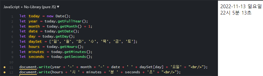 실시간 날짜와 시간을 가져오기 위해서는 제일 먼저 Date 객체를 만드는 것이 선행되어야 합니다.