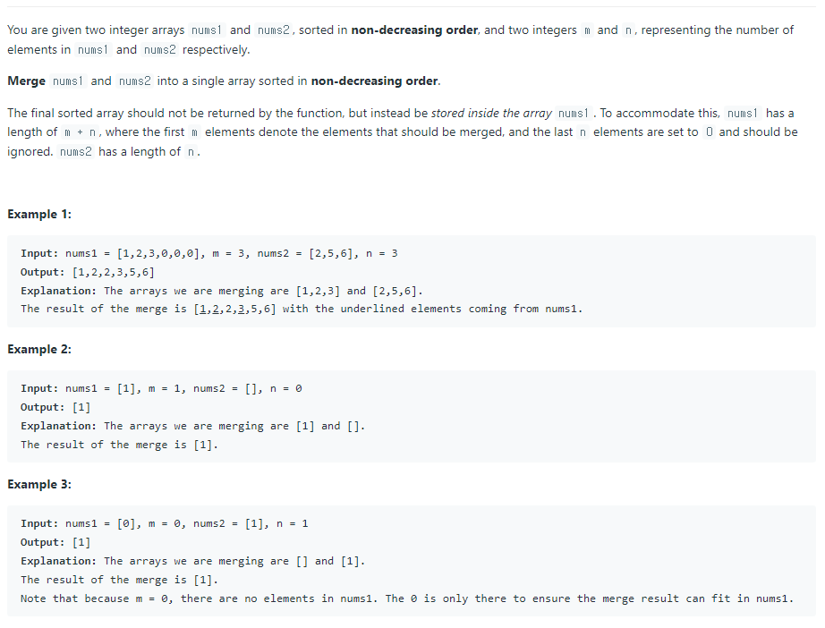 - 최종 정렬된 배열은 함수에 의해 반환되지 않고 대신 배열 nums1 내부에 저장되어야 합니다. 이를 수용하기 위해 nums1의 길이는 m + n입니다.