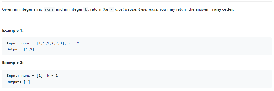 - 정수 배열 nums와 정수 k가 주어지면 가장 빈도가 높은 k개의 요소를 반환합니다.
